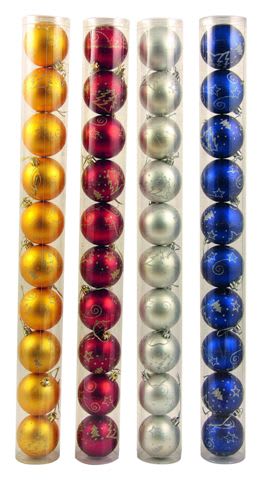 TUBO 10 SFERE, 2 DECORI, in palbox assortite: 18 oro, 18 rosso, 12 argento, 6 blu - ? 60 mm. imb.: 5