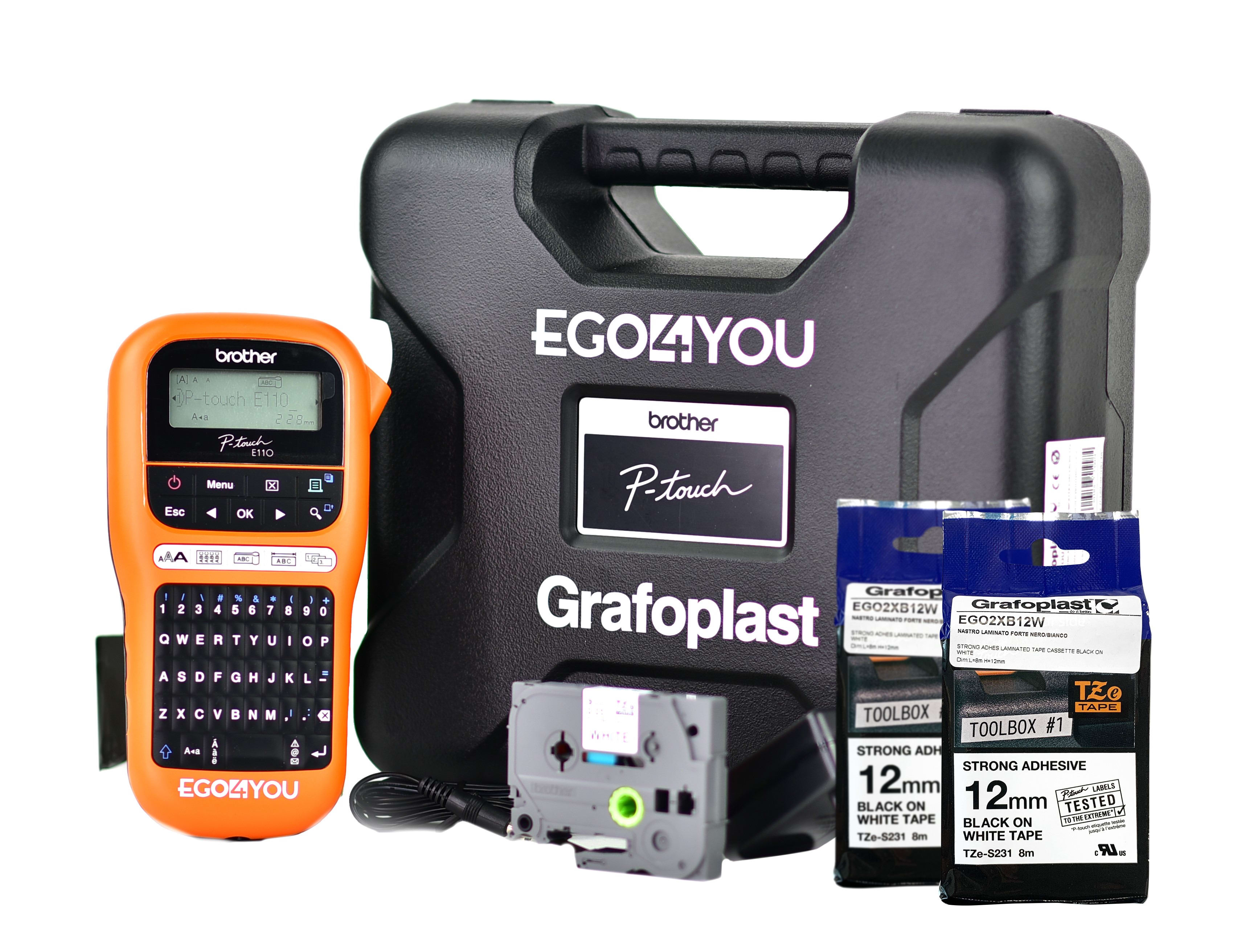 "COMPLETO DI DUE NASTRI BIANCHI 12 MM" EGO4YOU Etichettatrice industriale, crea etichette laminate professionali, a lunga durata per cavi, mascherine, quadri di distribuzione e altri impianti elettrici. • Funzioni dedicate per creare i tipi di etichettepiù comunemente utilizzati • 200 simboli inclusi quelli elettrici/datacom • Stampa etichette da 6, 9 e 12 mm • Dotata di cassetta di nastro flessibile da 9 mm EGO2FB09W, adattatore CA e valigetta per il trasporto (no batteria). Il modello entry-level, grazie alle funzioni dedicate, permette di creare rapidamente e facilmente tutti i tipi di etichette più comunemente utilizzati in varie combinazioni di colori e larghezze. La valigetta rigida consente di portare con sé tutto l’occorrente.