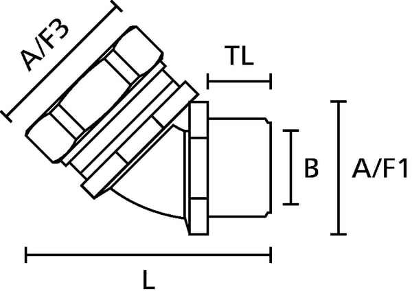 Raccordo a compressione composto da più elementi, curvato a 45° con guarnizione elastomerica. Garantisce una eccellente resistenza agli strappi. Filetto maschio, in ottone nichelato. Grado di protezione IP66, IP67, IP68 e IP69K.