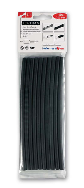 Guaina a parete sottile e flessibile in poliolefina reticolata. Elevato rapporto di restringimento (3:1). Pratici sacchetti di dimensioni ridotte con 10 spezzoni pretagliati di lunghezza 200 mm. Si adatta a cavi con diametro variabile. Le guaine HIS-3 insacchetto sono utilizzabili per l'isolamento e la protezione di cavi e cablaggi.