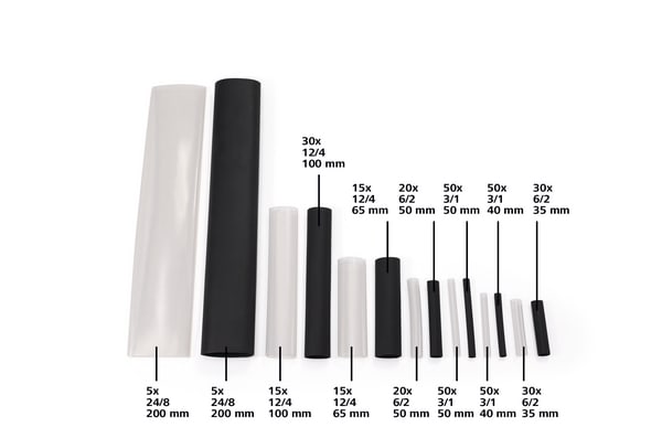 Guaina termorestringente con adesivo interno. La parete interna si fonde se riscaldata e si insinua negli interstizi. L'adesivo forma una barriera contro l'umidità quando la guaina si raffredda. Guaina nera per la protezione di connettori e derivazioni. Guaina trasparente ideale per la protezione delle etichette dei cavi. La dimensione degli scompartimenti può essere modificata spostando i divisori gialli. La guaina nera viene utilizzata principalmente per l'isolamento di derivazioni e connettori. La guaina trasparente invece viene tipicamente applicata come protezione dell'identificazione dei cavi.