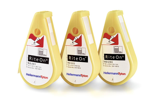 Dispenser compatto portatile di etichette autolaminanti. Facilita la scrittura e lo spellicolamento delle etichette. Vasta gamma di diametri di cavo coperti con i prodotti standard. Ideale per piccoli volumi per lavori di manutenzione e riparazione. Il testo si può scrivere con lo speciale pennarello con inchiostro ad asciugatura rapida. RiteOn Starter Pack L'ideale per cominciare ad utilizzare la comoda soluzione di HellermannTyton per l'identificazione manuale.Ricarica Le ricarche sonon disponibili in 6 differenti colori per ogni tipo di applicazione. Ricaricare il dispenser RiteOn è più che semplice. Pennarello Pennarello indelebile per una identificazione affidabile. L'inchiostro indelebile non è rimuovibile e si asciuga molto velocemente. Disponibile in coppie di colore nero o rosso.