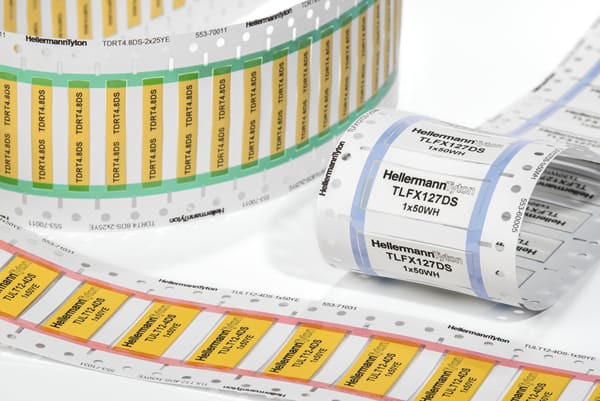 Rapporto di restringimento 3:1. Pretranciati a 50mm, 25mm e 16mm come standard. Disponibili in colore bianco e giallo. Buona resistenza meccanica e ai solventi organici e chimici. Elevata flessibilità. Forniti in comodi contenitori. Il TULT DS è un materiale termorestringente 3:1 certificato UL, pretranciato e disposto in un comodo formato Ladder Style. Questo formato permette non solo la stampa su entrambi i lati, ma anche la possibilità di prelevare il marcacavo desiderato con facilità. Il composto di poliolefina del TULT ha buone caratteristiche meccaniche e di resistenza ai solventi organici e chimici. La superficie della guaina viene preparata in modo da garantire una elevata qualità di stampa in ogni momento utilizzando le stampanti a trasferimentotermico di HellermannTyton.