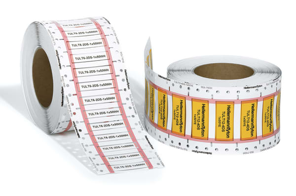 Rapporto di restringimento 3:1. Pretranciati a 50mm, 25mm e 16mm come standard. Disponibili in colore bianco e giallo. Buona resistenza meccanica e ai solventi organici e chimici. Elevata flessibilità. Forniti in comodi contenitori. Il TULT DS è un materiale termorestringente 3:1 certificato UL, pretranciato e disposto in un comodo formato Ladder Style. Questo formato permette non solo la stampa su entrambi i lati, ma anche la possibilità di prelevare il marcacavo desiderato con facilità. Il composto di poliolefina del TULT ha buone caratteristiche meccaniche e di resistenza ai solventi organici e chimici. La superficie della guaina viene preparata in modo da garantire una elevata qualità di stampa in ogni momento utilizzando le stampanti a trasferimentotermico di HellermannTyton.