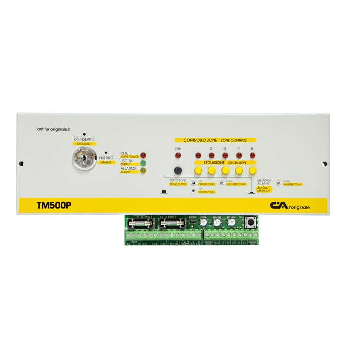 PANNELLO CENTRALE ANTIFURTO 5Z + 24H. •Inserimento/disinserimento con chiave meccanica integrata sul pannello o con sistema di comando opzionale •Tamper di protezione antiapertura •Parzializzazione ed esclusione zone con pulsanti •Autoinibizione di ogni zona (se non ripristinata) dopo aver generato un allarme •Conforme alla norma CEI EN 50131-