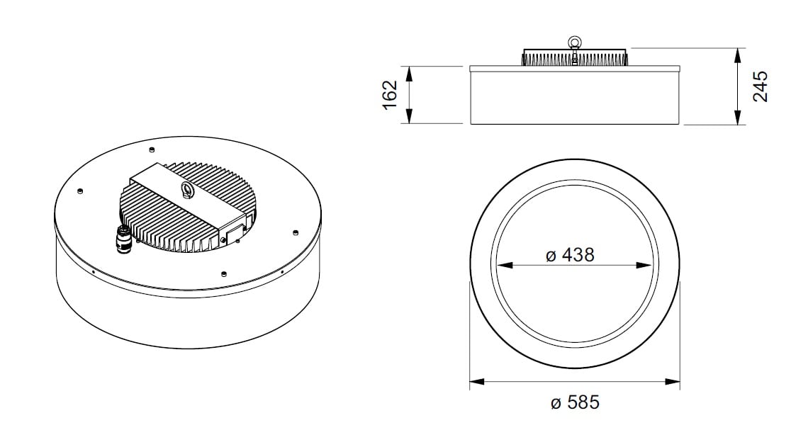Corpo in lamiera d’alluminio tornito in lastra, verniciata con polveri epossidiche con alta resistenza alla corrosione con pretrattamento di fosfocromatazione. Vetro temperato trasparente antishock termico. A richiesta sabbiato o microprismato. Guarnizione in silicone. Dissipatore: alluminio anodizzato. Presa femmina per alimentazione da cablare (7PR3702-V) inclusa. Alimentazione incorporata: CAE elettronica . Riflettore in alluminio tornito 99.85%, ossidato e brillantato anodicamente per un elevato rendimento luminoso. Sorgente luminosa LED 140W 17.500Lm 4000K. Colore: grafite. Emissione diretta. Sistema di fissaggio a sospensione con gancio in acciaio zincato. Non idonea per applicazioni all’esterno.
