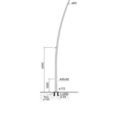 Palo conico curvo, H 8000mm. Palo di geometria conica curva, realizzato in acciaio zincato a caldo 70 micron come da normativa UNI EN ISO 1461 (EN 40-5), sottoposto a trattamento di verniciatura a polvere texturizzata RAL 9007. Il palo è costituito da un unico tubo metallico; è in acciaio EN10025-S235JR, ha un diametro alla base 172 mm e ø70 all’estremità superiore, spessore 3 mm e altezza 8000 mm f.t. L'asola per la portella è dimensiona a 400x90 mm, ad altezza 1000 mm dal terreno, idonea per il montaggio della morsettiera a due fusibili (cod. 1863). Il palo permette l'istallazione di morsettiere italiane (grado di protezione IP44 IK08), francesi, spagnole (solo piccole), inglesi (con adattatore in legno marino cod. BZC2 da ordinare separatamente) e tedesche/svizzere (tramite guida DIN cod. B943 da ordinare separatamente).Portella a filo, realizzata in acciaio IP30, con relativa chiave per la portella (cod. 0246); la chiusura è assicurata tramite una guarnizione di tenuta che si adatta alle irregolarità superficiali del palo. Nella parte superiore del palo è saldato un codolo ø60mm per il fissaggio del proiettore. All’altezza di 4000mm è saldato un codolo ø60 per l’installazione della versione intermedia. La piastra di ancoraggio per il supporto del palo è in acciaio zincato a caldo 70 micron; ha geometria quadrata, dimensioni 400x400 mm e spessore 20 mm. Le 4 asole, con interasse di 300x300 mm, permettono il passaggio dei tirafondi di fissaggio.Il palo è assicurato alla piastra tramite saldatura alla base. I tirafondi in acciaio, lunghi 500 mm e con diametro 24 mm, sono bloccati tramite viterie in acciaio.