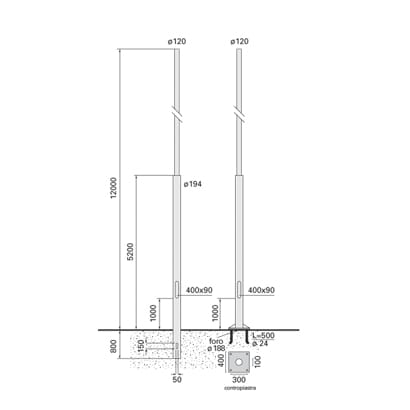 Palo rastremato stepped realizzato in acciaio zincato a caldo 70 micron, come da normativa UNI EN ISO 1461 (EN 40-5), con successivo trattamento superficiale di verniciatura acrilica a polvere texturizzata. La zincatura prevede l'operazione di agitatura,in modo da impedire l'accumulo di sali di zinco al suo interno. Il palo è costituito da due spezzoni cilindrici; è in acciaio EN10025-S355JR (ex Fe510 UNI7070); il primo cilindro ha diametro 194 mm, spessore 3 mm e lunghezza 5200 mm, mentre il secondo cilindro ha diametro 121 mm, spessore 4 mm e altezza 6800 mm. L'asola per la portella è dimensiona a 400x90 mm, ad altezza 1000 mm dal terreno, idonea per il montaggio della morsettiera a due fusibili (cod. 1863). Il palo permette l'installazione di morsettiere italiane/francesi/spagnole, inglesi (con adattatore in legno da ordinare separatamente) e tedesce/svizzere (con guida DIN da ordinare separatamente). Portella realizzata a filo, in fusione di alluminio; ad essa è correlata la relativa chiave, triangolare grande (9 mm lato chiave) per portella (cod. 0246). La chiusura è assicurata tramite una guarnizione di tenuta antinvecchiante che si adatta alle irregolarità superficiali del palo. La portella è montata per mezzo di una contropiastra, fissata all'interno al palo tramite saldatura a punti. Internamente al palo è saldato un gancio metallico, atto a supportare la morsettiera. Esso è costituito da un tondino metallico, di diametro 4 mm, ripiegato due volte, di dimensioni 40x26 mm. La piastra di ancoraggio per il supporto del palo è in acciaio EN 10025-S235JR (ex Fe 360 UNI 7070) zincato a caldo 70 micron, come da normativa UNI EN ISO 1461 (EN 40-5); ha geometria quadrata, con 4 smussi 40x45°, dimensioni 415x415 mm e spessore 20 mm. Le 4 asole di dimensione 67x30 mm, con interasse di 300x300 mm, permettono il passaggio dei tirafondi di fissaggio. Il palo è assicurato alla piastra tramite saldatura alla base; inoltre 4 alette di rinforzo sono saldate intorno ad esso. I tirafondi in acciaio, lunghi650 mm econ diametro 24 mm, sono bloccati tramite viterie in acciaio. Il palo presenta 4 fori passanti, con inserti filettati in acciaio inox per permettere il fissaggio del tirante. All'estremità superiore del palo viene installato un tappo di chiusura realizzato in policarbonato (siliconato dall'utente). Il palo è idoneo per resistere alla spinta dinamica del vento, in conformità alle normative vigenti descritte nel Decreto Ministeriale del 16/01/96.