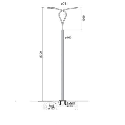 Palo di geometria cilindrica, realizzato in acciaio zincato a caldo 70 micron come da normativa UNI EN ISO 1461 (EN 40-5), sottoposto a trattamento di verniciatura a polvere texturizzata RAL 9005.Il palo è costituito da un unico tubo metallico; è in acciaio EN10025-S235JR, ha diametro 160 mm, spessore 3 mm e altezza 6700 mm f.t. L'asola per la portella è dimensiona a 310x95 mm, ad altezza 1000 mm dal terreno, idonea per il montaggio della morsettiera a due fusibili (cod. 1863). Il palo permette l'istallazione di morsettiere italiane (grado di protezione IP44 IK08), francesi, spagnole (solo piccole), inglesi (con adattatore in legno marino cod. B944 da ordinare separatamente) e tedesche/svizzere (tramite guida DIN cod. B943 da ordinare separatamente).Portella a filo, realizzata in fusione di alluminio, con relativa chiave per la portella (cod. 0246); la chiusura è assicurata tramite una guarnizione di tenuta che si adatta alle irregolarità superficiali del palo. Il palo è completo di braccio doppio di lunghezza 1400 mm (per ciascun braccio). Bracci realizzati in acciaio S235JR ø76mm spessore 4mm. Nella parte superiore del palo è saldata una piastra metallica realizzata in acciaio zincato, munita di 4 fori filettati, adibita al fissaggio dei bracci per mezzo di viti M10 UNI 5931 in acciaio inox AISI 304.