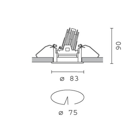 Incasso rotondo con cornice di battuta. Versione orientabile con rotazione interna 355° e movimento basculante max 30°. Il gruppo orientabile, ruotando in posizione arretrata rispetto al filo dell'incasso, assicura una diffusione puntuale ma estremamente confortevole, con una sensibile riduzione dell'abbagliamento diretto. Il corpo orientabile in alluminio pressofuso include una superficie radiante che garantisce un'ottimale dissipazione del calore. 7,5W 710 lm 2700K CRI90. 42°