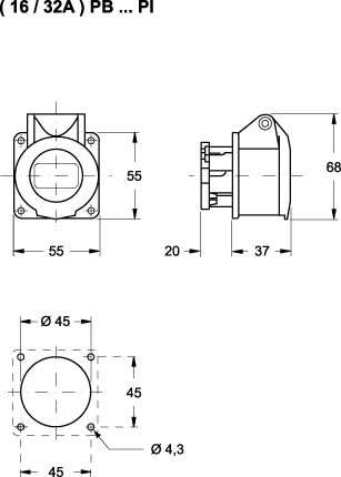 Prese da incasso per uso industriale bassissima tensione • Conforme alle norme CEI EN 60309-1 e -2 • Corpo, frutto e coperchietto in materiale isolante termpolastico autoestinguente • Prese: coperchietto a molla • Flangia completa di guarnizione antinvecchiamento • Dimensioni flangia: 55x55 mm