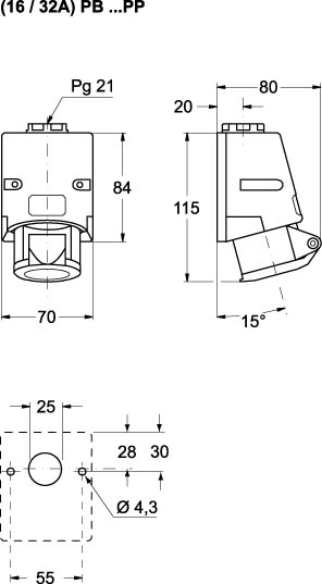 Prese da parete per uso industriale bassissima tensione • Conforme alle norme CEI EN 60309-1 e -2 • Corpo, frutto e coperchietto in materiale isolante termpolastico autoestinguente • Prese: coperchietto a molla • Entrata dall'alto con passafilo avvitato (sostituibile con pressacavo) • Pg 21 • 20÷25V e 40÷50V DC