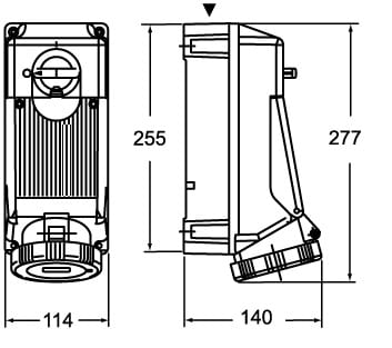 TM prese per usi industriali IP66/IP67 con dispositivo di blocco, da quadro o da parete. Prese con interruttore di blocco. Esecuzione: con scatola base. Normativa di riferimento: EN 60309-1 e -2. Riferimento Orario: 6.3P+N+T. Tensione: 200/346 ÷ 240/415 V. Frequenza: 50 e 60 Hz. Corrente:32A (C.A.). Grado di protezione IP66/IP67 (EN 60529). Grandezza: 114x255 fissaggio tavolette TM xx45 TB. Tipo materiale isolante.