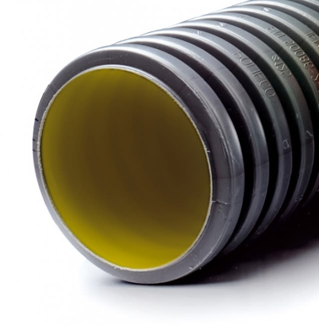 Tubo corrugato esternamente e liscio internamente denominato CAVIDOTTO A DOPPIO STRATO (Licenziatario del marchio IMQ). • Mescola di polietilene neutro alta densità, masterbatch colorante additivato con anti-UV per resistenza di 1 anno a 130 KLangley. • Colore grigio parete esterna, giallo parete interna. • Impiego per la protezione cavi elettrici B.T. (bassa tensione) e telefonici interrati. • Limiti d'impiego: - per ambienti con una temperatura compresa tra i -10 e i 40°C. - Propagante la fiamma. • Raggio di curvatura minimo: 8 volte il ØN. • Resistenza allo schiacciamento (EN 50086-2-4 / CEI 23-46 / Variante A1) ≥750 N con deformazione diametro interno pari al 5 % (campioni da 200 mm). • Accessori: -Manicotti di giunzione in polietilene alta densità acorredo. -Guarnizioni elastomeriche per la tenuta a richiesta. • Installazione sotterranea in trincea. • IMBALLO: BARRE DA 6 METRI. TOLLERANZA SULLA LUNGHEZZA ±1%