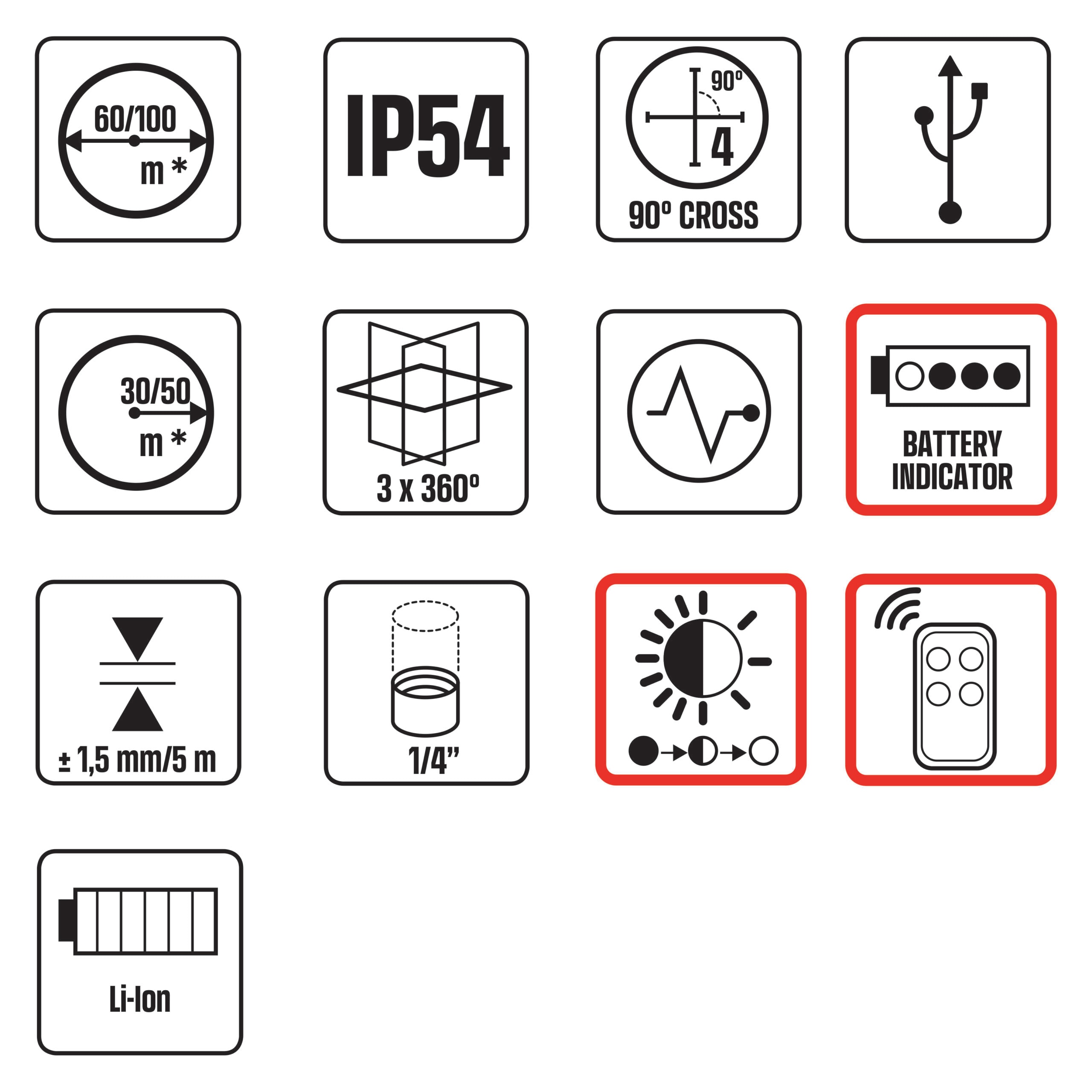 Proietta 3 piani laser a 360°: un piano orizzontale e due piani verticali Fornito con telecomando, supporto magnetico a parete, girevole, bersaglio, cavo USB e custodia Uso interno/esterno (con ricevitore non incluso, item 60749) Batteria interna agliioni di litio ricaricabile tramite il cavo USB in dotazione