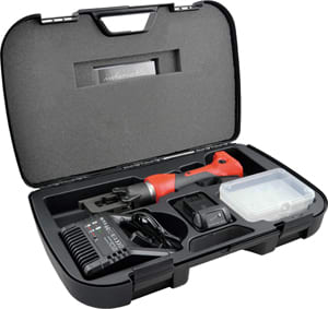 Idoneo per la compressione di terminali e giunti fino ad una sezione massima del conduttore di 150 mmq.\n\nCaratteristiche:\n• utensile oleodinamico a batteria 18V Li-Ion 1,5 Ah\n• impugnatura ergonomica a due componenti per il massimo comfort e utilizzo con una sola mano\n• testa di compressione ruotabile per 360° che garantisce l'uso anche in spazi limitati,\n• costruzione leggera, robusta e compatta\n• avanzamento rapido tramite sistema di una poma assiale a 3 pistoni\n• ritorno rapido mediante valvola di ritegno\n• ritorno manuale possibile in qualsiasi posizione premendo il pulsante centrale\n• interfaccia USB: lettura e registrazione di tutti i cicli effettuati, indicazioni tramite LED a tre colori multifunzionali, avviso della manutenzione (dopo 20.000 cicli), controllo della pressione, registrazione di eventuali errori o anomalie, stato della carica batteria estrazione dei dati tramite software di controllo fornito nella confezione.\n\nDotazione STILO45:\n• pressa oleodinamica a batteria\n• batteria Li-Ion 18V 1.5 Ah - RA12\n• caricabatteria, cavo USB e Software (CD)\n• valigetta rigida in resina con inserto termoformato