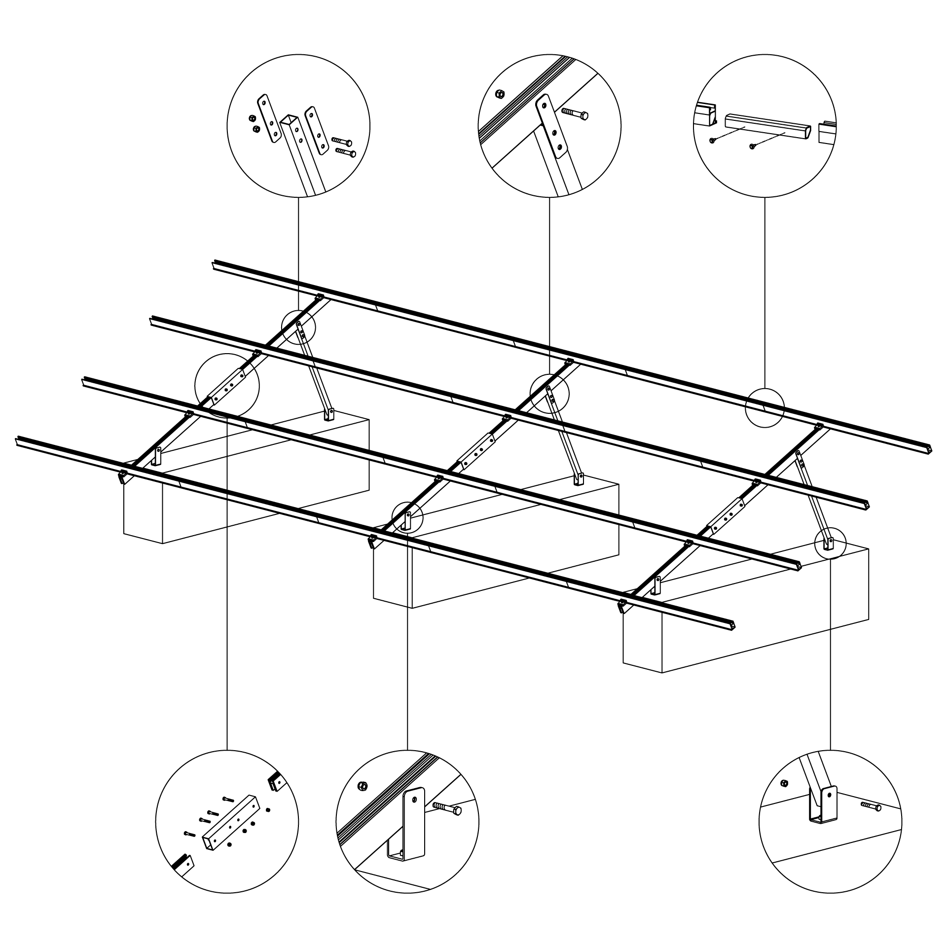 Sistema A-Rack: Componenti per il montaggio di moduli FV per piccoli progetti a terra e sistemi off-grid. Progettato per carichi di vento e neve fino a 0.8 kN/m?. Nota bene: le fondamenta in cemento devono essere acquistate in loco o create dal cliente, non sono incluse nella fornitura.