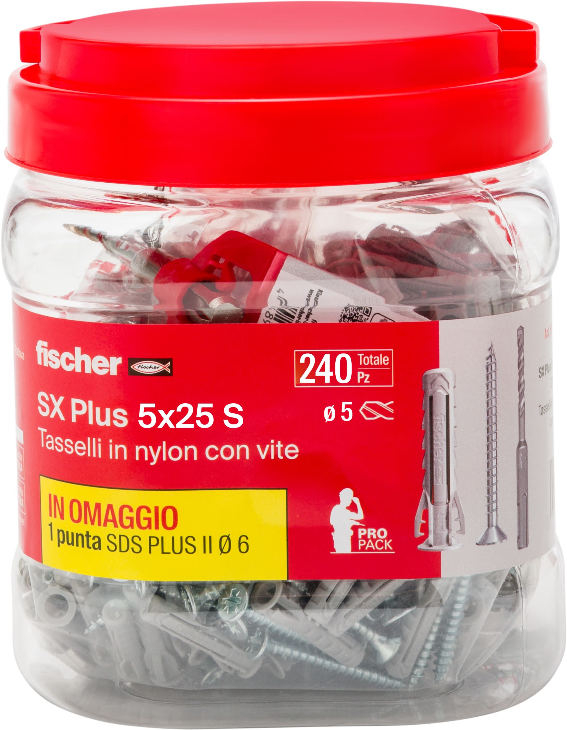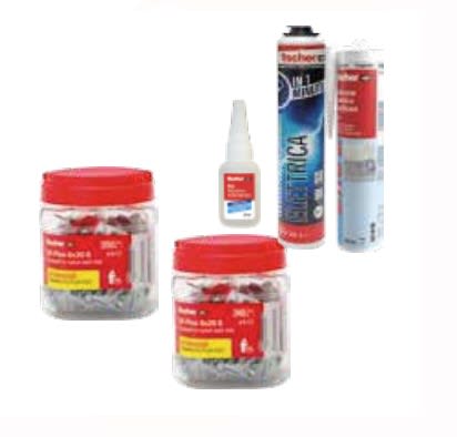 KIT PROMO FISCHER KIT DEGLI INDISPENSABILI DI FISCHER: • 1 PZ FIS00508055 Adesivo istantaneo SG - liquido e incolore. • 1 PZ FIS00570205 Barattolo 240 pz di tasselli con vite SX Plus 5x25 + punta SDS-Plus in omaggio • 1 PZ FIS00570206 Barattolo 200pz di tasselli con vite SX Plus 6x30 + punta SDS-Plus in omaggio • 1 PZ FIS00572433 Schiuma elettrica presa rapida • 1 PZ FIS00009351 Silicone acetico trasparente 280 ml