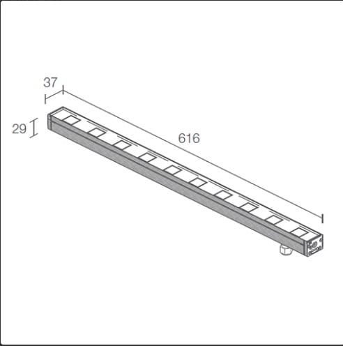Neva 1.0 - Profilo lineare da esterno, calpestabile; su superficie (soffitto, parete, pavimento) con staffe, a incasso (soffitto, parete, pavimento) con cassaforma; corpo in alluminio estruso anodizzato lega EN AW 6060, schermo in vetro temprato serigrafato; 10 power LED passo 60 mm; 18W - 24Vdc; incluso cavo in neoprene di 1,5 m H05RN-F 2x0,75 Ø6,3 mm; flusso totale: 1150 lm (3000K, 18W), ottiche: 30°; colore LED: bianco - 3000K; grado di protezione: IP67; grado di resistenza: IK06; dotato di sistema IPS integrato nel pressacavo; temperatura di esercizio: -20°C+45°C; temperatura schermo: max 40°C (Ta 25°C); Glow wire test: 960°; sicurezza fotobiologica: gruppo rischio 1 secondo EN62471:2006; classe di isolamento III; peso 1,15 kg; dimensioni 616x37x29mm; dimmerazione disponibile mediante dimmer in linea 24Vdc; accessori: cassaforma WC6510, cassaforma per cartongesso WC6710, coppia staffe h 75 mm WM0601, coppia staffe h 140 mm WM0602, kit anticaduta WN6001, nido d'ape WH6010, frangiluce in acciaio inox verniciato nero WB6510. LED bianco 18W 3000K 1150lm 30°.