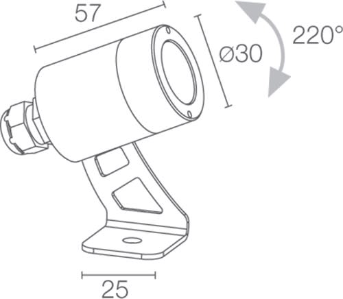 Proiettore da esterno (non adatto per immersione); su superficie (soffitto, parete, pavimento, picchetto); corpo e ghiera in acciaio inox AISI 316L; schermo in vetro trasparente temprato. 3W. 24VDC. 5000 K. 40°. 145 lm