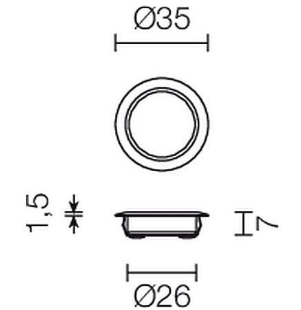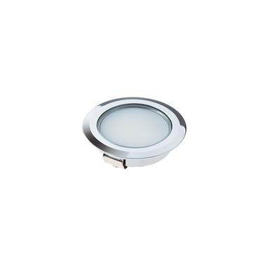 Apparecchio a incasso da interno; 1W - 220mA; 1 power LED; 3000K; CRI: 75÷85; ottica diffusa con opalino; flusso totale: 37 lm (3000K a 220mA); corpo in alluminio lega EN AW 6012 con trattamento di anodizzazione bianca, schermo esterno in vetro; finiturain cromo/perla; temperatura di esercizio: 0°C +45°C; grado di protezione contro i liquidi e i corpi solidi: IP44; Glow wire test: 960°; sicurezza fotobiologica: gruppo rischio 1 secondo EN62471:2006; montaggio a incasso con molle; classe di isolamento III; peso 0,10kg; dimensioni Ø26x7mm; foro d'incasso Ø28mm; volume d'ingombro Ø40x10mm; collegamento in serie, con cavo 1,5m tipo Fror Ø3,5 2x0,35; dimmerazione disponibile mediante alimentatore dimmerabile.