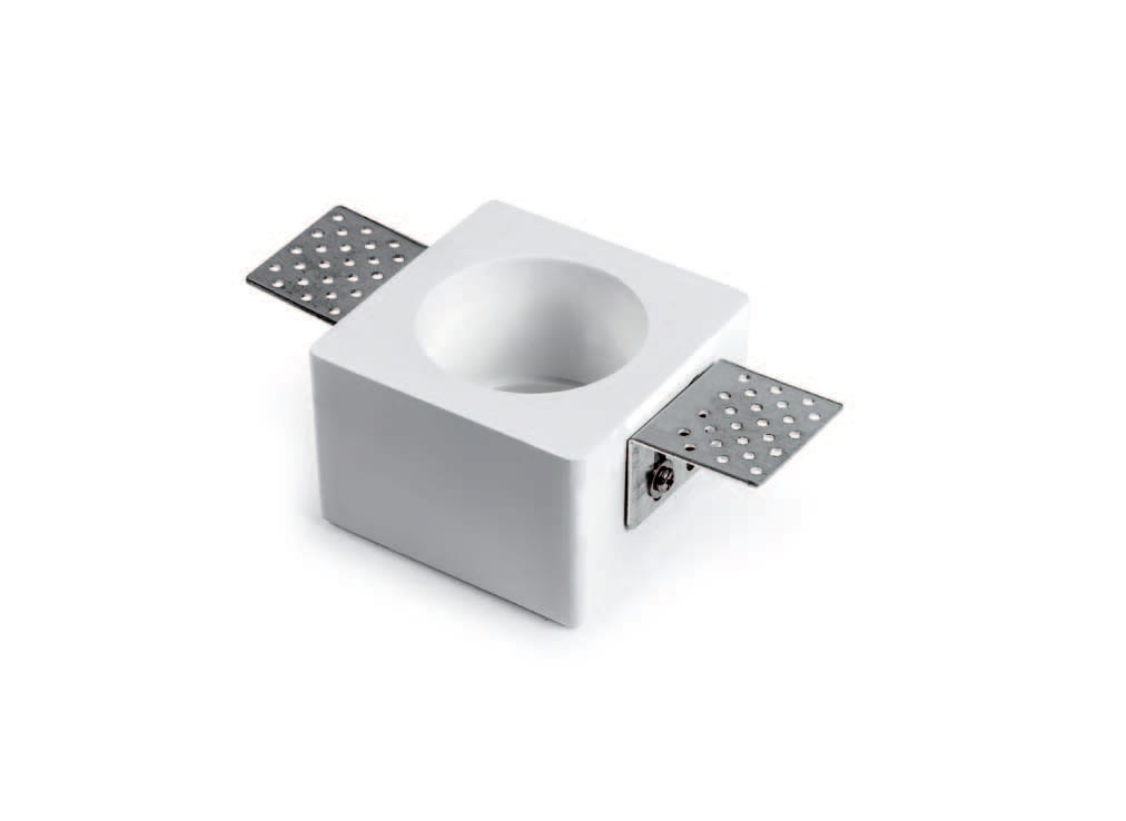 FARETTO IN GESSO QUADRATO H 55 mm - Faretto quadrato da incasso in gesso con spessore ridotto H 55 mm, da integrare nel cartongesso per dare omogeneità tra soffitto e corpo illuminante. Il foro cilindrico profondo permette di nascondere la lampadina e ottenere un raggio di luce più ristretto. Le staffe regolabili permettono anche un montaggio leggermente sporgente. Staffe regolabili per spessori da 8 a 21 mm. Portalampade GU10 incluso. Lampada non incluso. IP20. Classe II. Max 1x50W GU10 230V. Colore: Bianco.