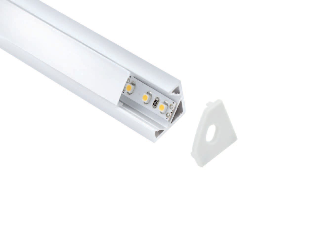 KIT PROFILO ANGOLARE - Profilo alluminio angolare L. 2 mt per strisce led completo di accessori, confezionato singolarmente con nr. 1 diffusore opaco in policarbonato, nr. 2 tappi chiusi, nr. 1 tappo con foro, nr. 4 clips di fissaggio il tutto incluso nella confezione. Potenza MAX consigliata 15w/ml. Finitura: Alluminio.