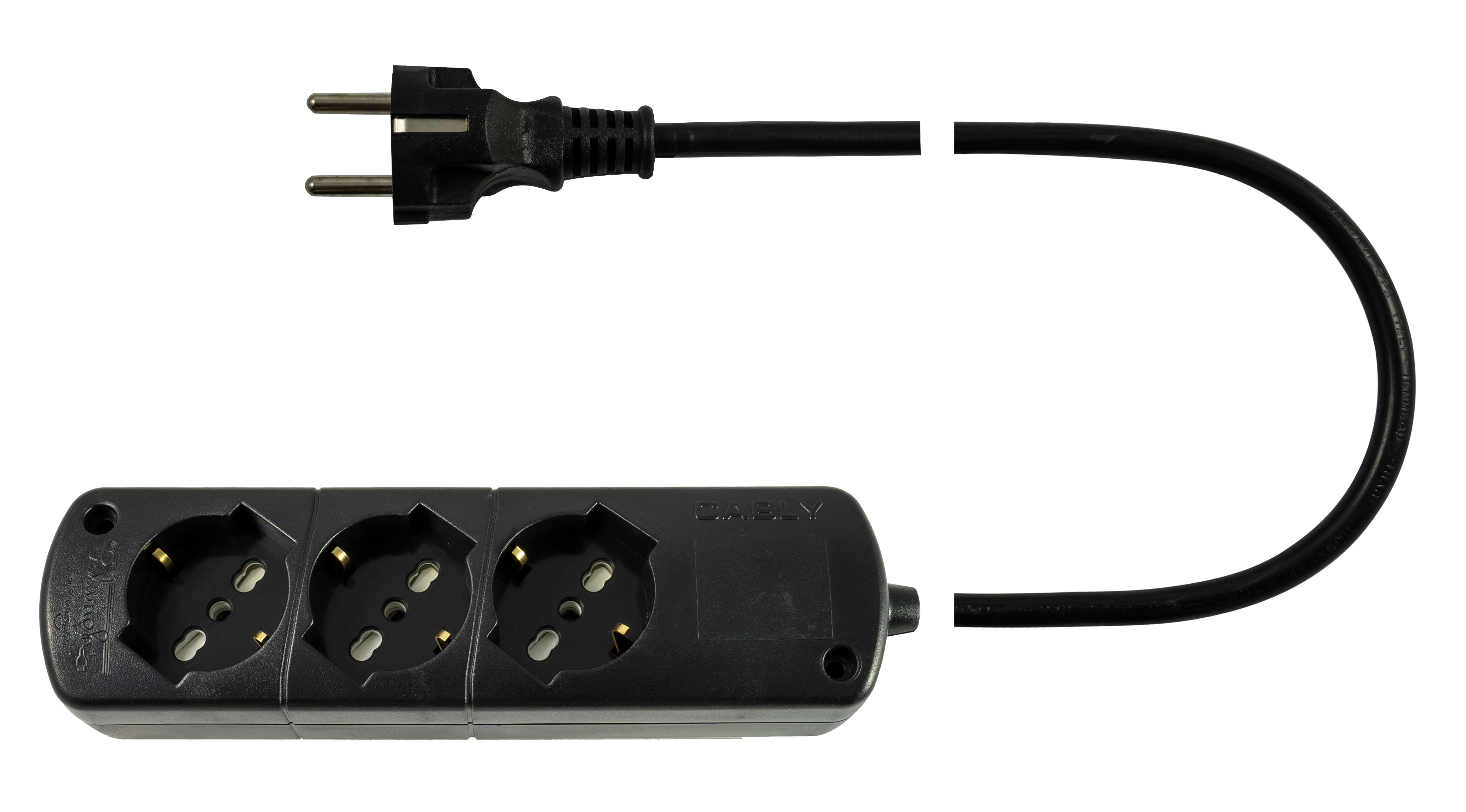 TAVOLETTE MULTIPRESA Tavoletta Cably multipresa universale con prese 10/16A + Schuko e spina Schuko IMQ ? Cavo plastigomma H05VV-F ? Sezione 3G1.5mm2 3 Uscite - Colore nero ? Lunghezza 3 m