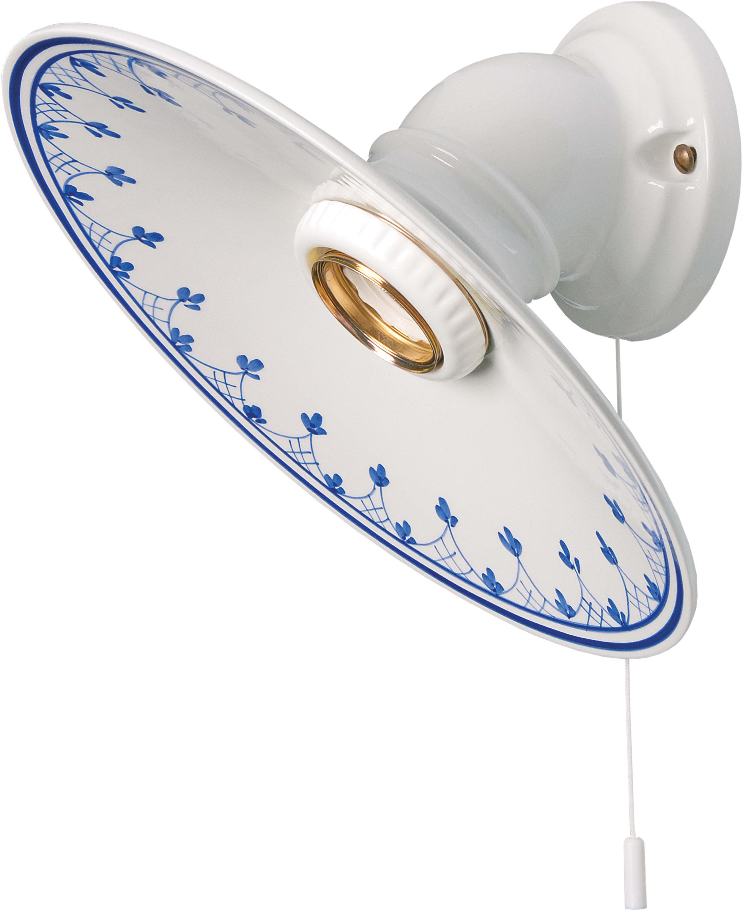 SERIE CLASSIC - IN PORCELLANA BIANCA Spot a parete - Attacco E27 - Potenza 60W - Grado di protezione IP 20 - Con interruttore a catenella Con ghiera in porcellana bianca - Con piatto decorato bordo blu diametro 22 cm in porcellana bianca