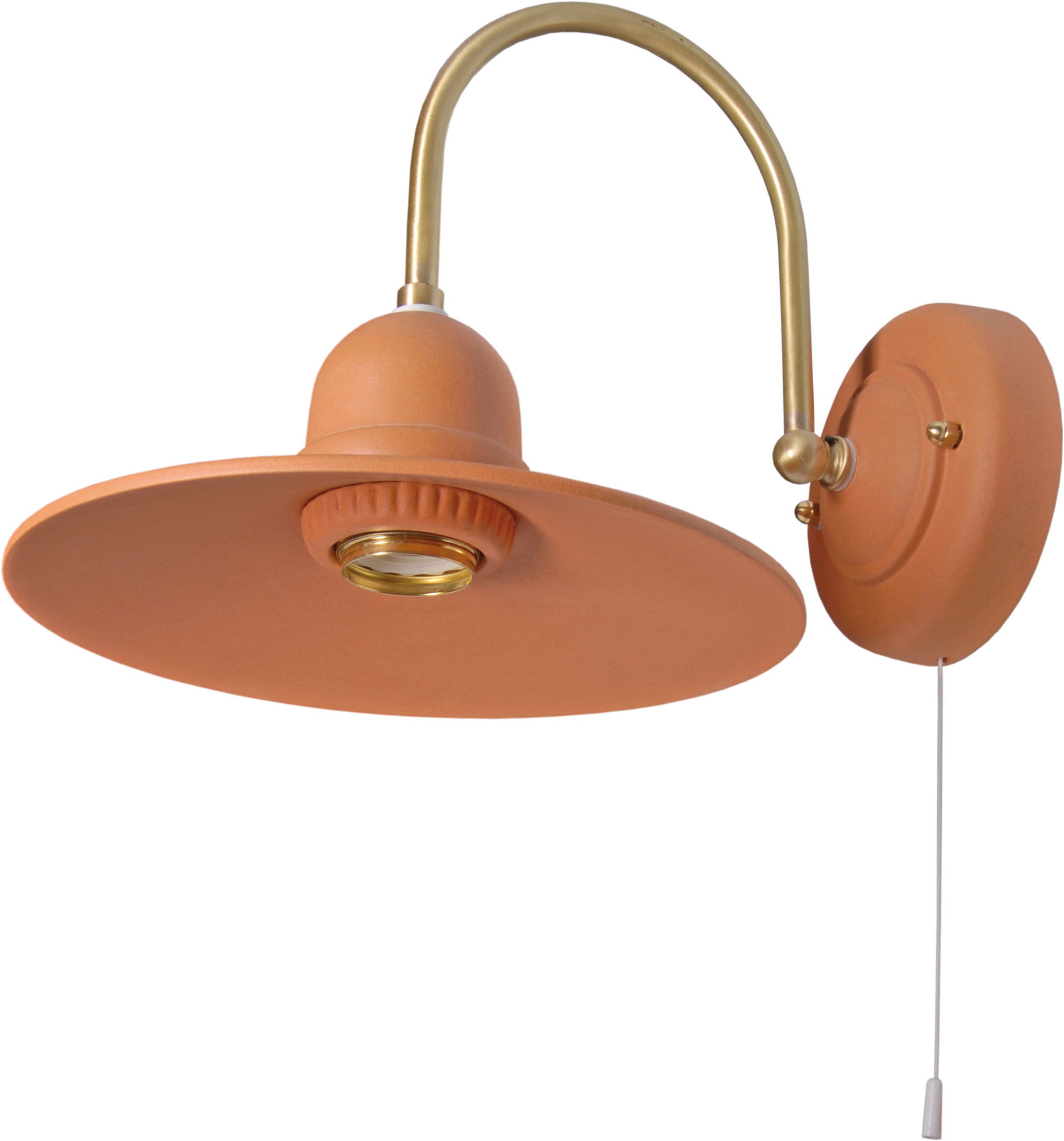 SERIE CLASSIC - APPLIQUE DA PARETE con interruttore a tirante Applique da parete - Attacco E27 - Potenza 60 W - Grado di protezione IP 20. Ad una luce. Base in cotto. Braccio in metallo ottonato. Bicchiere in cotto. Ghiera in cotto. Con piatto liscio diametro 22 cm in cotto.