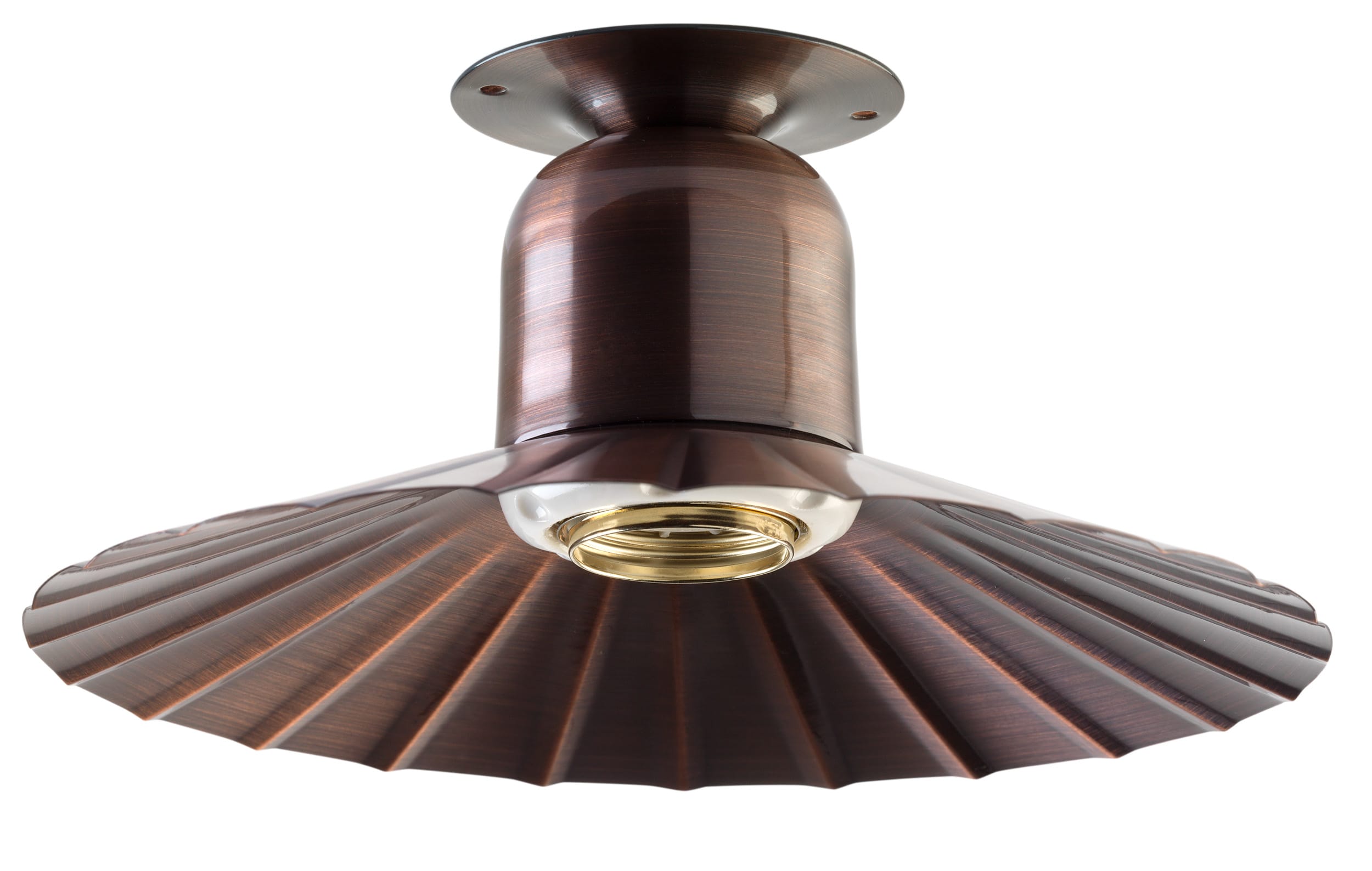 SERIE CLASSIC - IN RAME ANTICATO Spot diritto a parete o soffitto - da usare singolo od in abbinamento a base rame o base porcellana 2.0 -Attacco E27 - Potenza 60W - Grado di protezione IP 20 Con ghiera in porcellana bianca - Con piatto piega diametro 22cm in rame anticato