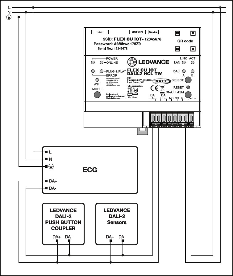 Centralina di controllo per un massimo di 128 luci e fino a 126 sensori/accoppiatori pulsanti. Caratteristiche del prodotto: Centrale certificata DALI-2 per un massimo di 128 luci e 126 accoppiatori sensori-pulsanti. IoT-ready con gateway integrato per l'accesso da remoto dei dati. Compatible with LEDVANCE DALI IoT WEB UI and DALI IoT CONFIG software. Integrazione di Building Management System tramite interfaccia KNX (opzionale). Messa in servizio tramite Ethernet/WLAN. Fattore di forma ridotto: solo 6 TE (binario DIN). Lunghezza del cavo di controllo DALI: fino a 300 m. Vantaggi del prodotto: Certificato DALI-2 per una migliore interoperabilita multi-vendor. BIOLUX Human Centric Lighting per una luce naturale di alta qualita durante il giorno negli uffici. Accesso da remoto per modifiche all'impianto da ogni postazione. Interconnessione LAN per connettere fino a 8 controller in una rete. Rest API for connection of a 3rd party Cloud with the FLEX CU IOT DALI-2 HCL TW Controller. Adatto per VIVARES Cloud Services (opzionale). Aree di applicazione: Illuminazione di aree fino a 1000 mq con una sola unita di controllo. Controllo della stanza e del piano. Collegamento di sensori di luce e presenza per il controllo automatizzato della luce. Applicazioni RGB e Tunable White. Apparecchiatura / Accessori: App per iOS e Android disponibile gratuitamente nell'App Store.
