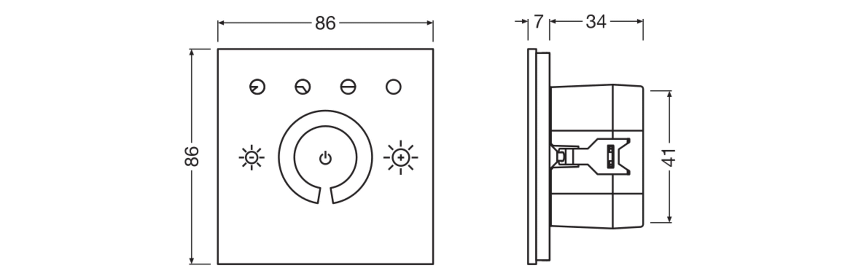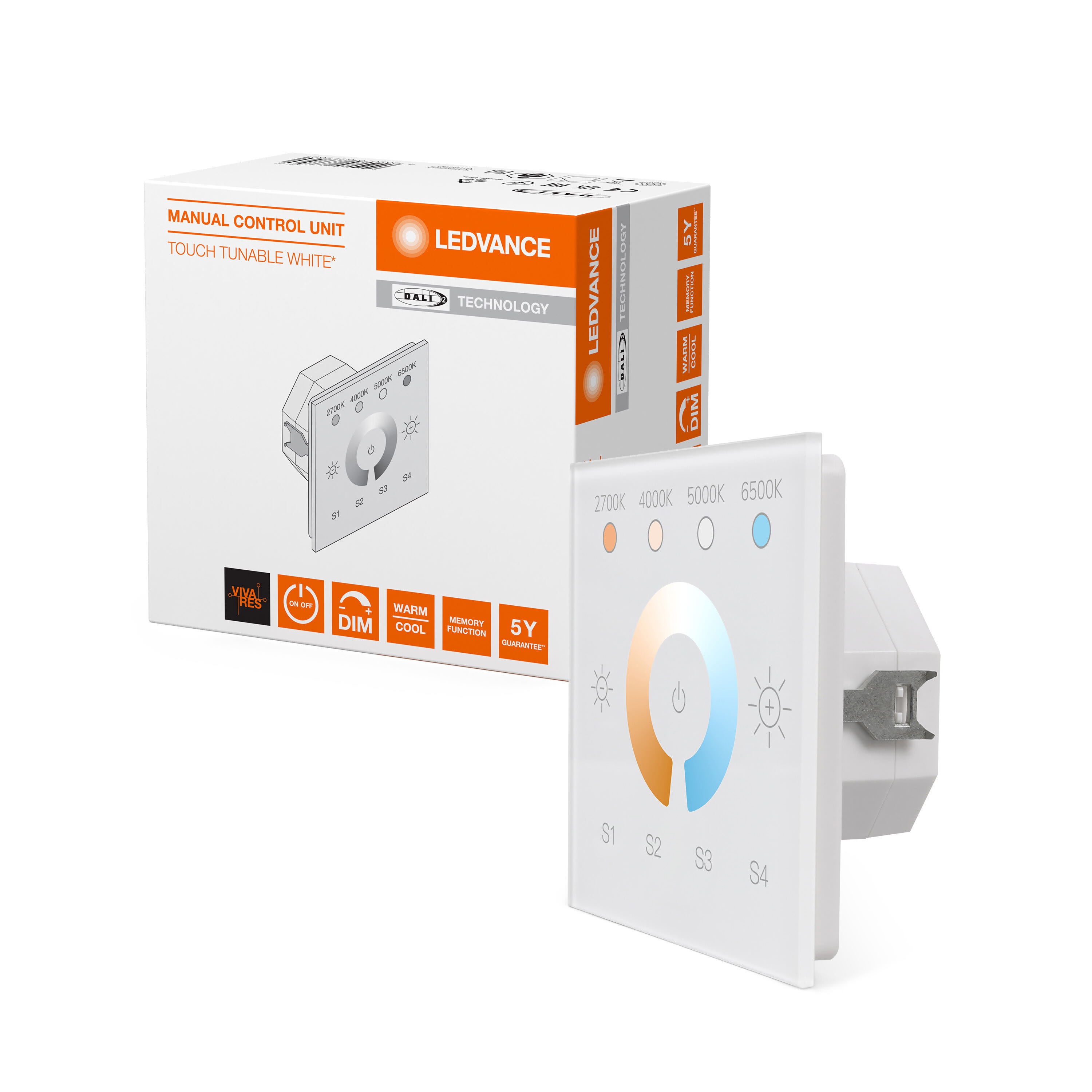 Unità di controllo manuale con display touch per un massimo di 25 luci, abilita l'illuminazione Tunable White. Caratteristiche del prodotto: Dispositivo di controllo DALI-2 per installazione in scatole da incasso standard. Superficie touch per il controllo manuale della luce. È possibile collegare in parallelo fino a 4 dispositivi di controllo per creare più punti di controllo. Sincronizzazione automatica tra i punti di controllo. Numero di luci DALI per unità di controllo: fino a 25. Lunghezza del cavo di controllo DALI: fino a 300 m. Vantaggi del prodotto: Funzionamento semplice e intuitivo. Dimmerazione manuale, commutazione e salvataggio delle impostazioni di luce. Regolazione individuale del livello di luminosità e della temperatura del colore. È possibile impostare il comportamento dopo l'interruzione dell'alimentazione. Copertura in vetro di alta qualità. Funzionamento con alimentazione di rete (modalità attiva) o alimentazione DALI (modalità passiva). Disponibile telaio per montaggio superficialeopzionale. Compatibile con il sistema di gestione della luce LEDVANCE VIVARES DALI (apparecchi di illuminazione LEDVANCE DALI). Aree di applicazione: Soluzione monolocale con massimo 4 vani di accesso. Sale riunioni e conferenze. Ristoranti. Illuminazione di negozi. Case private.