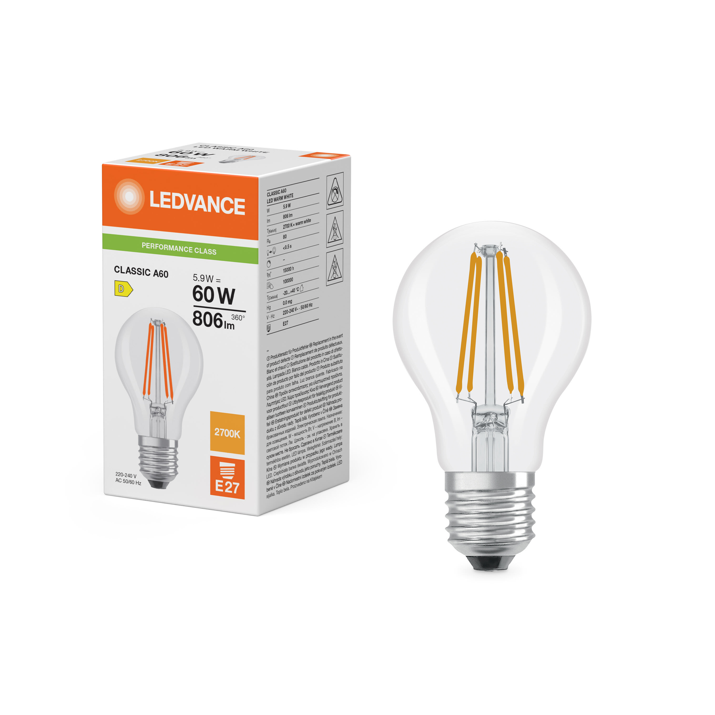 LEDVANCE - LDVPCA60827C2 LED CLA60 5.9W 827 FILCL E27 P LEDV
