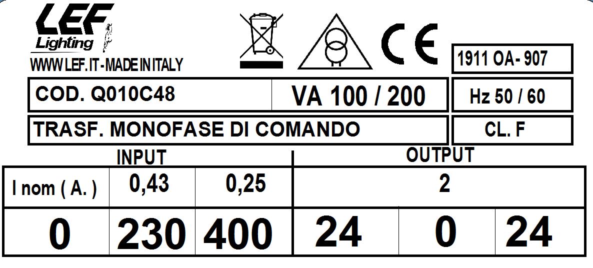 LEF LIGHTING SRL - LEFQ010C48 T.M. 100VA 230.400V / 24.0.24V