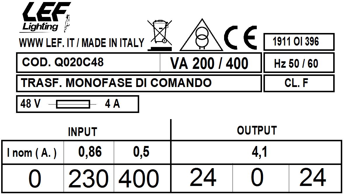 LEF LIGHTING SRL - LEFQ020C48 T.M. 200VA 230.400V / 24.0.24V
