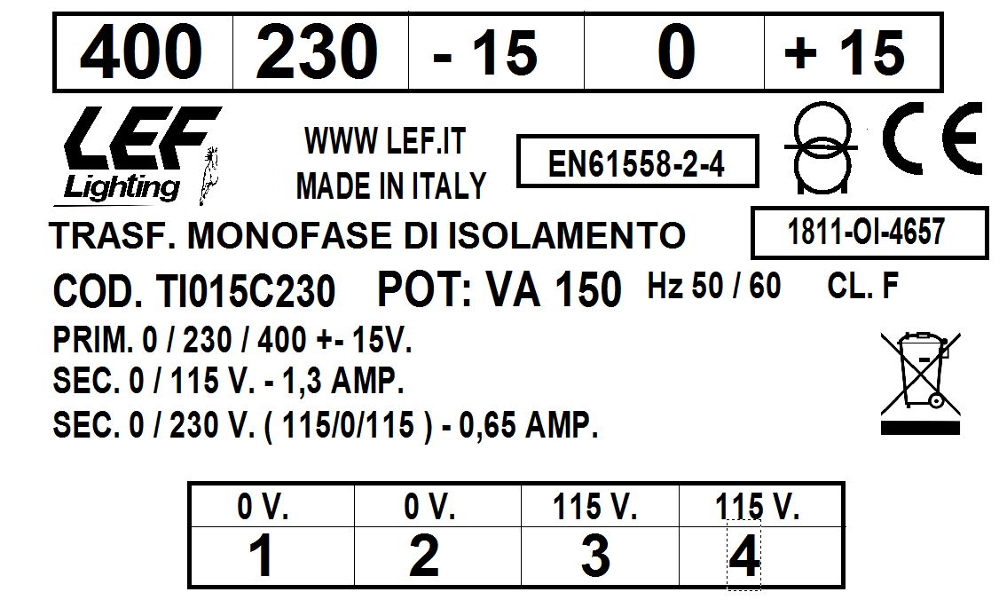LEF LIGHTING SRL - LEFTI015C230 T.M. 150VA 230.400V / 115 230V