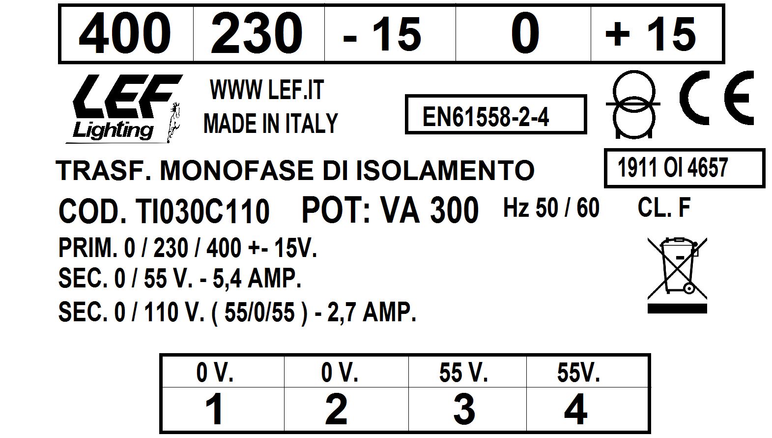 LEF LIGHTING SRL - LEFTI030C110 T.M. 300VA 230.400V / 55 110V