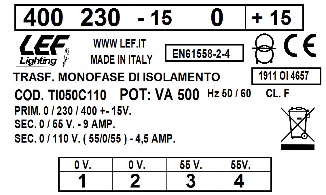 LEF LIGHTING SRL - LEFTI050C110 T.M. 500VA 230.400V / 55 110V