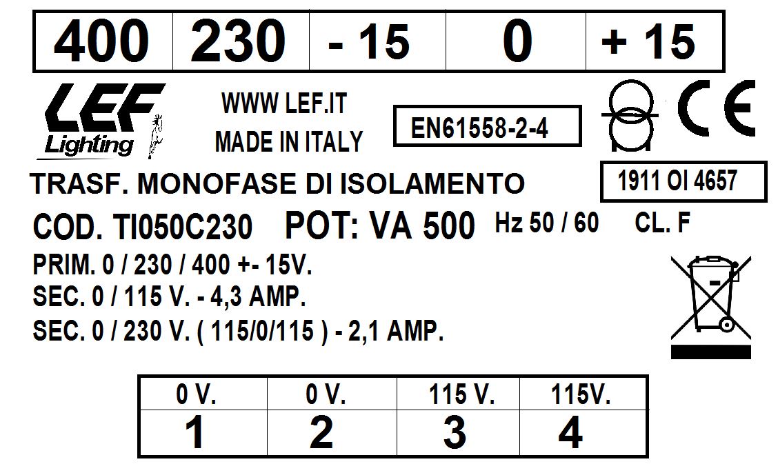 LEF LIGHTING SRL - LEFTI050C230 T.M. 500VA 230.400V / 115 230V