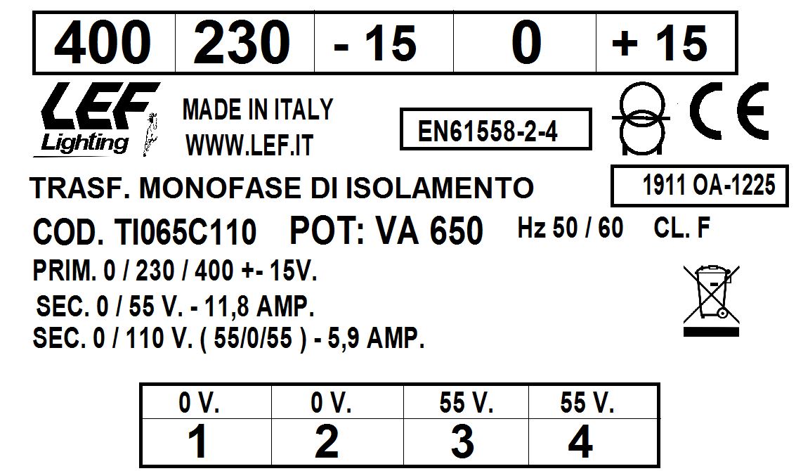 LEF LIGHTING SRL - LEFTI065C110 T.M. 650VA 230.400V / 55 110V