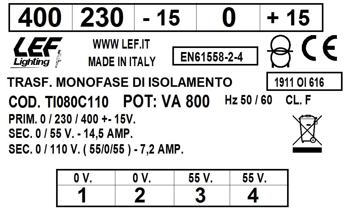 LEF LIGHTING SRL - LEFTI080C110 T.M. 800VA 230.400V / 55 110V