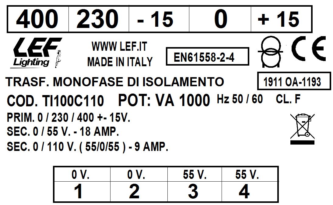 LEF LIGHTING SRL - LEFTI100C110 T.M. 1000VA 230.400V / 55 110V