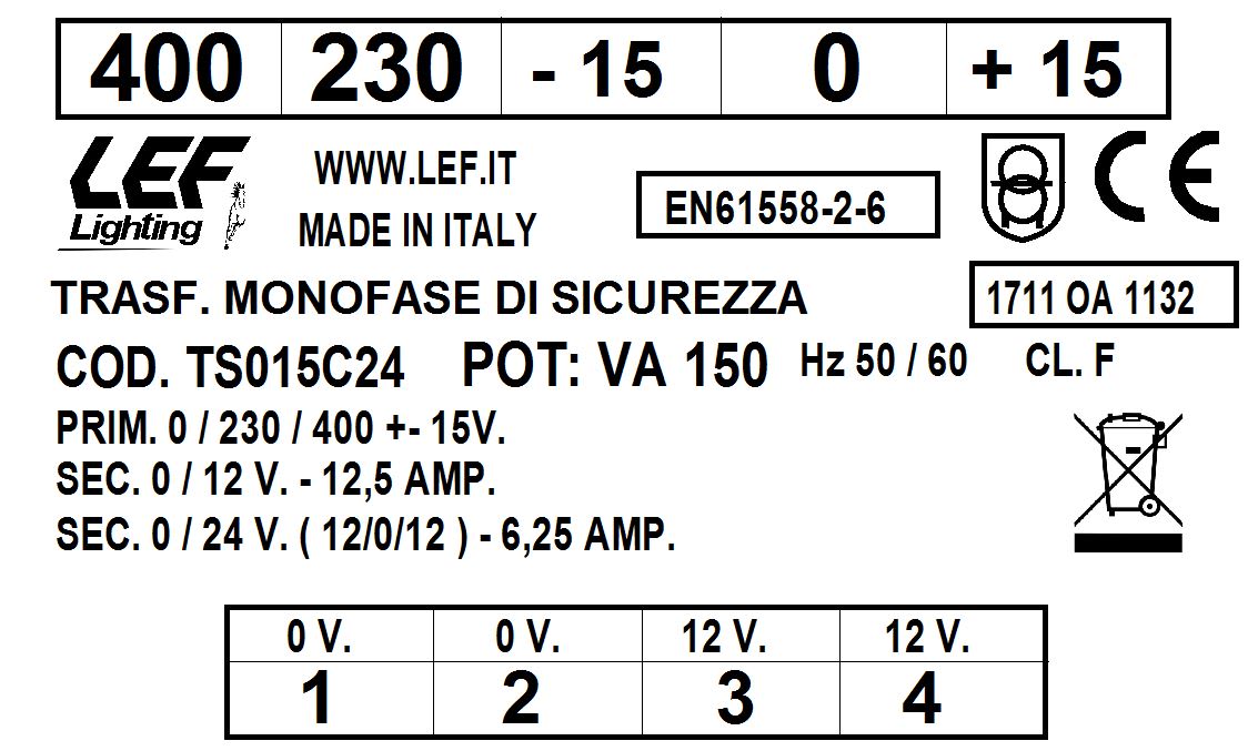 LEF LIGHTING SRL - LEFTS015C24 T.M. 150VA 230.400V / 12 24V