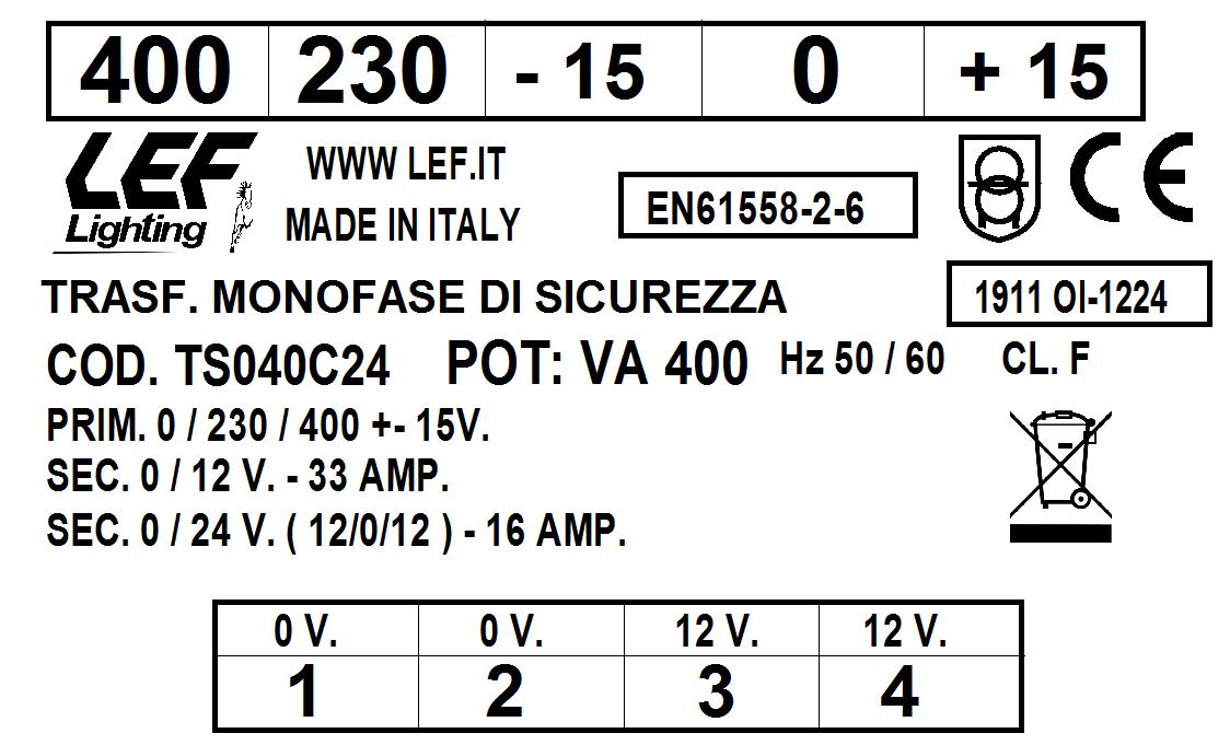 LEF LIGHTING SRL - LEFTS040C24 T.M. 400VA 230.400V / 12 24V