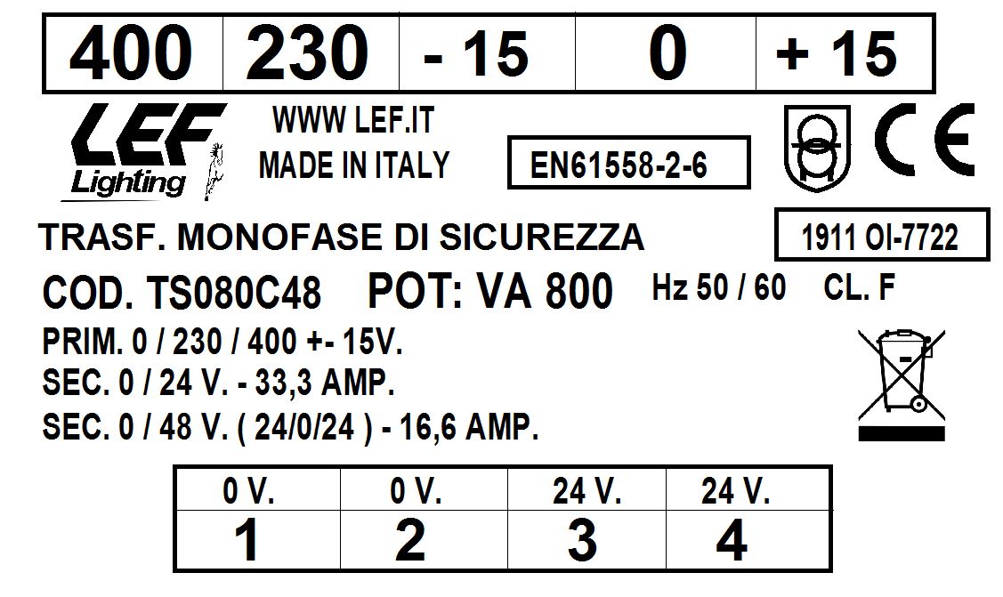 LEF LIGHTING SRL - LEFTS080C48 T.M. 800VA 230.400V / 24 48V