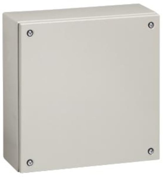 Cassette di derivazione metalliche 400 x 400 x 120 mm. Cassette in lamiera d’acciaio spessore 9/10um. Fissaggio del coperchio con viti antisfilamento. Verniciatura poliestere RAL 7035. Equipaggiate con 2 montanti verticali preforati Grado di protezione IP66 secondo EN 60529 e IK10 secondo EN 50102.