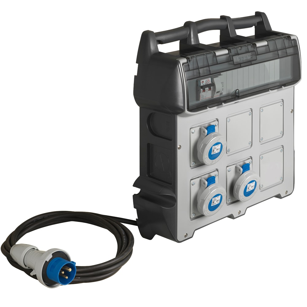 Quadri da pavimento IP44, IK09. Corpo in ABS e finestre in policarbonato. Fissaggio a muro senza dover aprire il centralino. Prefratture addizionali per 2 ingressi cavi (max. M32) sopra e 1 su ogni lato + 1 presa domestica addizionale su ogni lato. Supporti per fissaggio cavi (non forniti a corredo). Da equipaggiare con al massimo 6 prese: presa da pannello domestica Art. 0 576 76, prese da pannello industriali 16/32 A IEC, con fissaggio standard. Piastra per pulsanti di emergenza Art. 0 577 45, 1 adattatore Art. 0 539 51 per dispositivi serie MATIX. Forniti con 2 copriforo. Equipaggiati con morsettiere IP2X per cavo di protezione, 9 copriforo modulari, 3 piastre cieche per prese