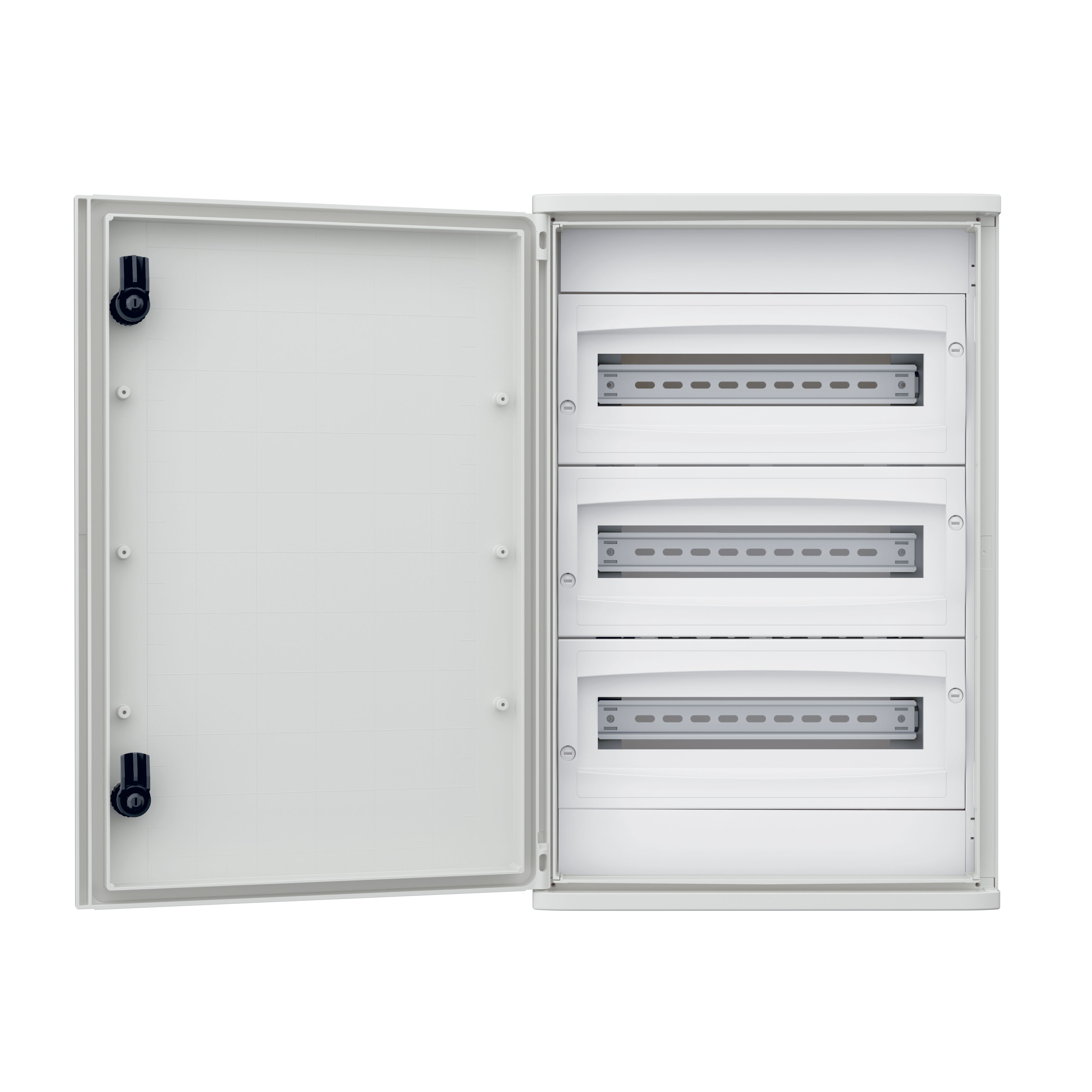 Telaio modulare in plastica per quadri 600 x 400 x 250 mm (3x16 moduli DIN). Kit completo fornito con montanti e pannelli finestrati. Fornito con 1 otturatore. Per quadri Atlantic-E, Atlantic inox e Marina