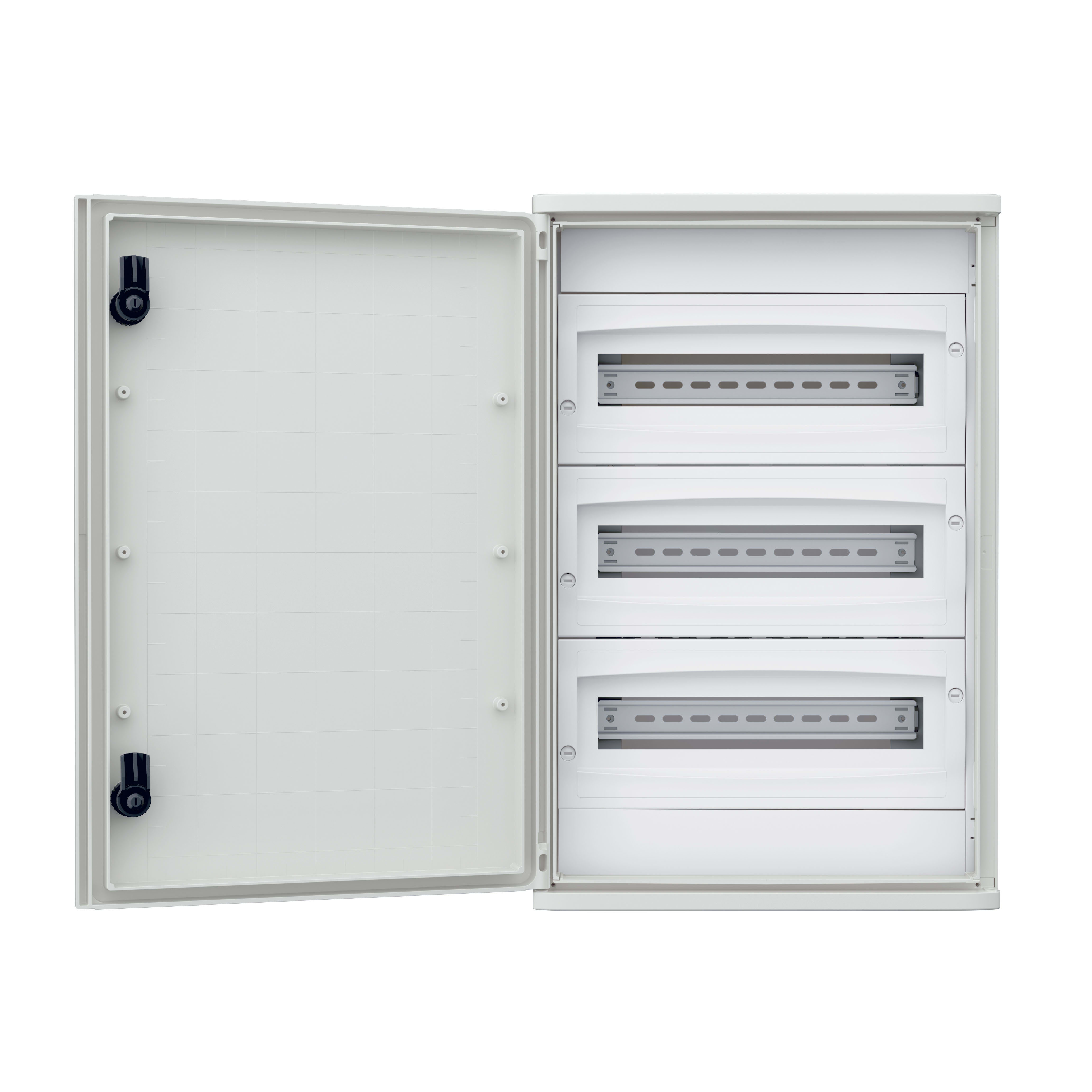 Telaio modulare in plastica per quadri 800 x 600 x 300 mm (4x27 moduli DIN). Kit completo fornito con montanti e pannelli finestrati. Fornito con 2 otturatori Per quadri Atlantic-E, Atlantic inox e Marina